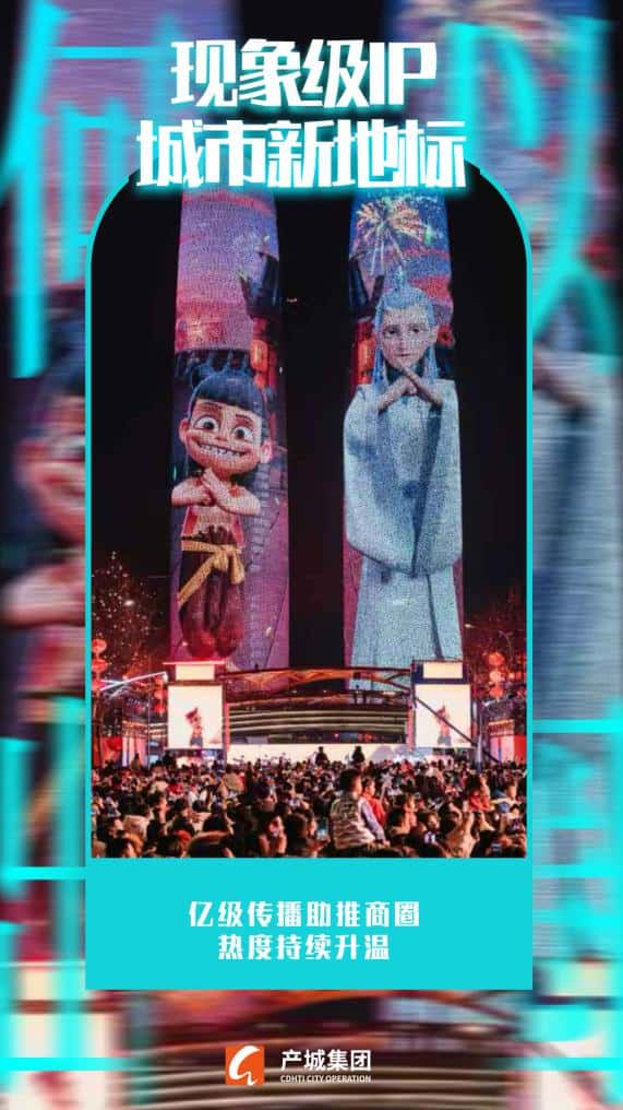 随着现象级IP“哪吒”的快速出圈,产城集团“趁热打铁”,在交子大道策划推出“哪吒+敖丙”主题灯光秀首秀,联合成都可可豆动画影视有限公司举办电影《哪吒之魔童闹海》幕后创作展首展等,相关话题阅读量破亿,吸引超5万人次现场观看,商圈热度持续升温。