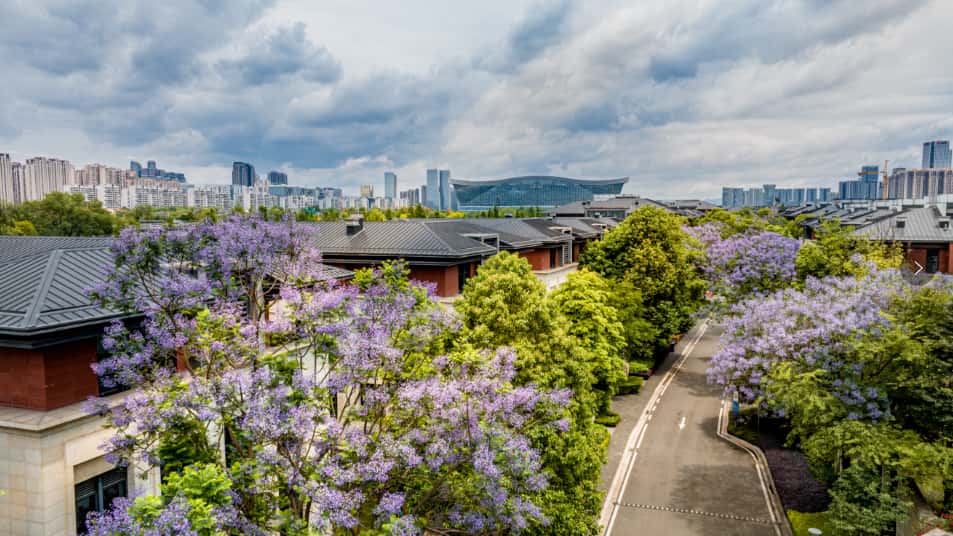 与大多数产业园区“严肃”的画风不同,天府长岛数字文创园以川西都市林盘为特色,在城南高楼林立之间打造了一片公园产业社区。除了紧邻文化艺术中心和锦城湖,一路向北,经铁像文旅环串联,这里还同铁像寺水街、大源中央公园、骑龙公园等文创旅游节点形成空中绿道系统,构建起产业公园化、商业社区化的发展新模式。