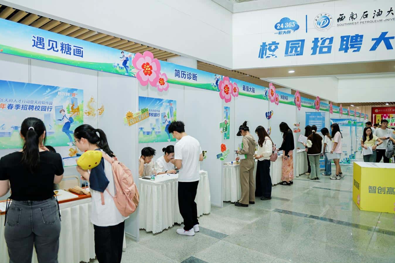 在这其中,电子科技大学专场首创MBTI人格主题交互区,划分“I人”与“E人”专属空间,帮助求职者更好地展示自我;成都信息工程大学专场邀请本土现象级IP《哪吒之魔童闹海》真人COSER助阵,实现了科技与国漫的精彩碰撞;四川大学专场特设“冰糖葫芦工坊”与“简历诊疗所”,以甜蜜滋味化解求职焦虑,提供定制化职涯规划服务。