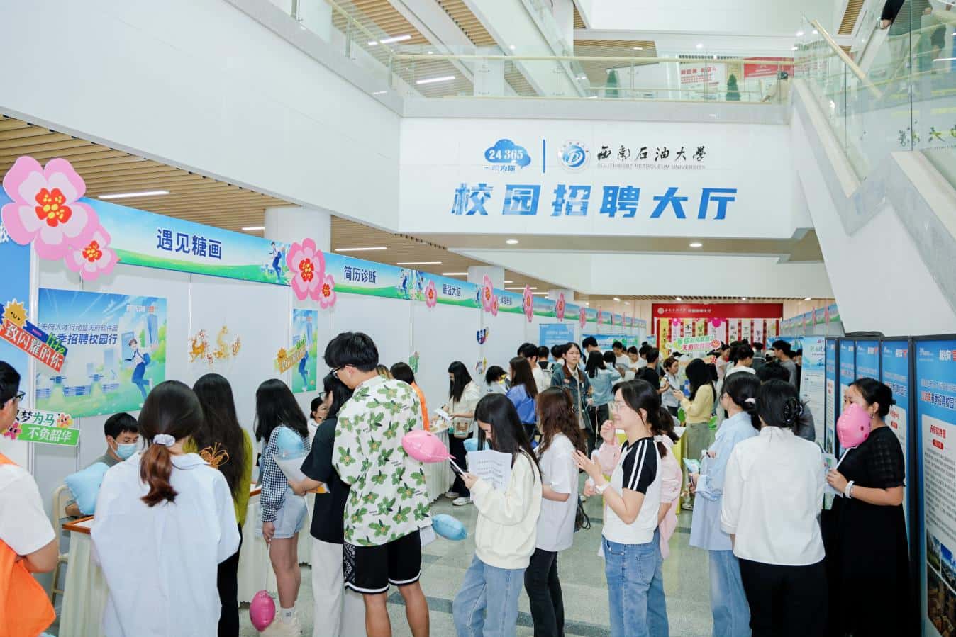 本次招聘活动以“年轻态”为核心,策划了包括6场线下招聘会、3场直播带岗以及3场线上面试在内的12场丰富多彩的活动。活动现场以“多巴胺春天”为主题,运用高饱和色彩搭配和趣味互动装置,将传统招聘场景升级为充满青春活力的求职场域,为求职者搭建了展现自我的舞台。