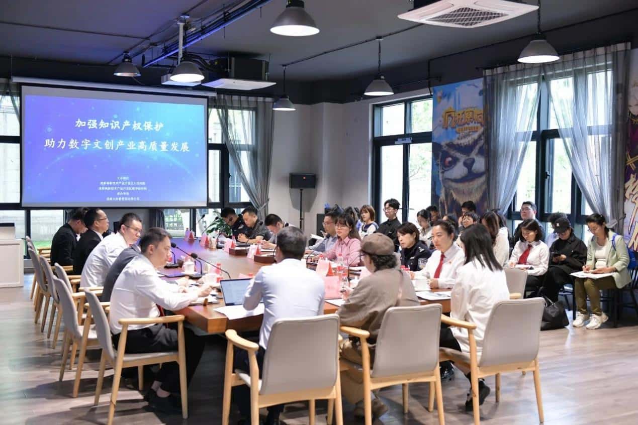 当天,与会嘉宾一行参观了天府长岛数字文创产业服务平台展厅,详细了解园区企业的文化创意成果案例。随后,与会单位与企业代表分别就强化数字文创产业版权保护、人工智能生成内容的法律属性认定、知识产权犯罪行为取证等主题进行了深入交流。