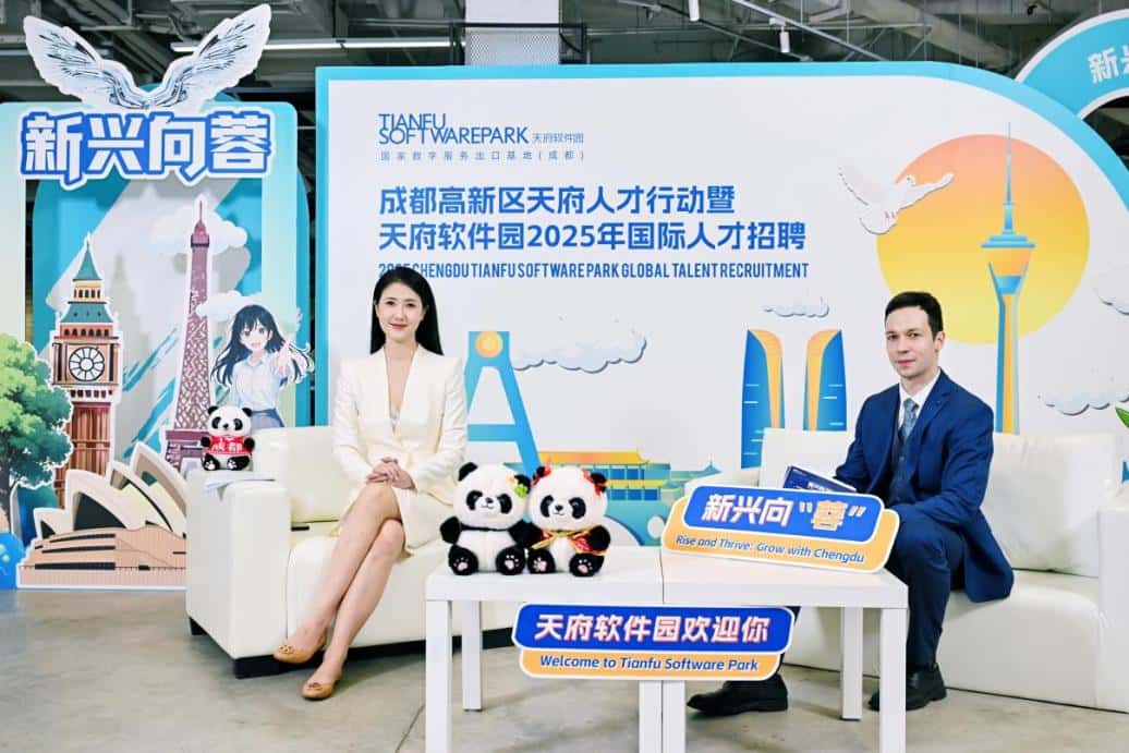 7月16日,软件园公司举行“‘新兴向蓉’2025年国际人才招聘”全球直播活动,通过51job、微赞、YouTube等平台同步播出,覆盖北美、欧洲、亚洲等地区,吸引近20万人次在线观看。