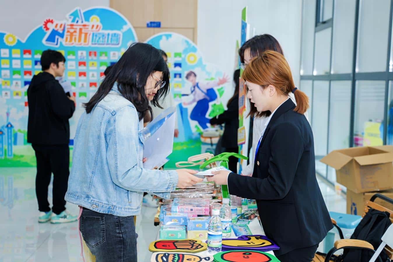 本次招聘活动以“年轻态”为核心,策划了包括6场线下招聘会、3场直播带岗以及3场线上面试在内的12场丰富多彩的活动。活动现场以“多巴胺春天”为主题,运用高饱和色彩搭配和趣味互动装置,将传统招聘场景升级为充满青春活力的求职场域,为求职者搭建了展现自我的舞台。
